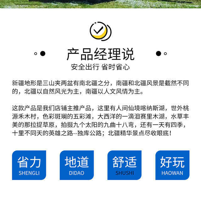 1,新疆面積比較大,景點(diǎn)與景點(diǎn)之間距離比較遠,乘車(chē)時(shí)間比較長(cháng),再有新疆安檢比較多,區間限速,修路,盤(pán)山路等因素;因此游客要有早出晚歸的心里準備。本行程備注公里數和時(shí)間均為百度搜索或經(jīng)驗總結,不作為官方數據,僅供游客參考;
