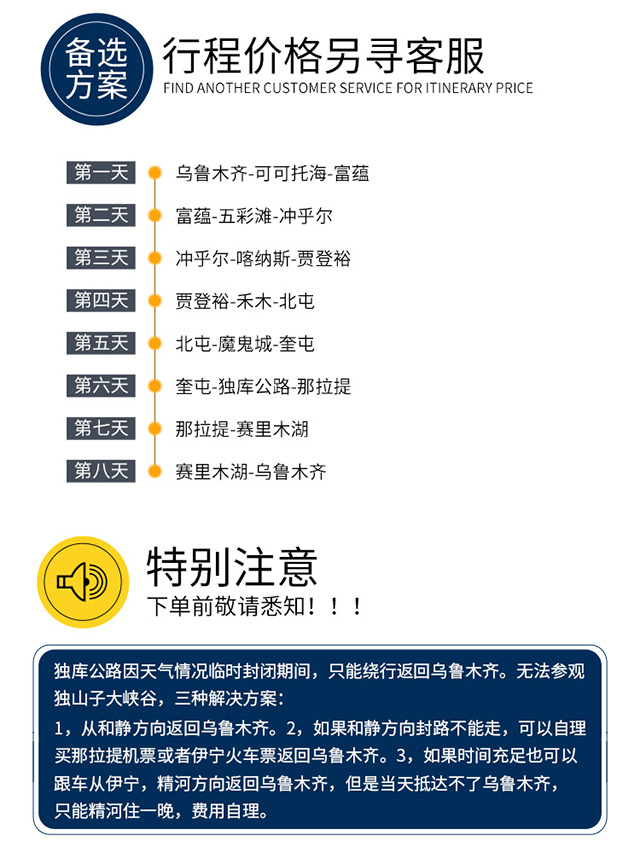 4.由于獨庫公路受制于天氣影響,按慣例只有每年6月-9月中旬能通行,如遇特殊天氣當地交管部門(mén)會(huì )采取封路措施以保障安全,如遇封路情況將無(wú)法通過(guò)獨庫公路,只能繞路返回烏魯木齊,行車(chē)路程和時(shí)間均會(huì )增加。方案一:沿G218國道從和靜縣方向返回,方案二:G218國道也封路,只能選擇返回那拉提和伊寧市方向返回,當日無(wú)法抵達烏魯木齊,可從那拉提機場(chǎng)乘飛機,或在伊寧市乘飛機或火車(chē)離團,因封路屬不可抗力因素,產(chǎn)生的火車(chē)票或飛機票費用需游客自行承擔;如需隨車(chē)次日返回,當日食宿費用游客自理。