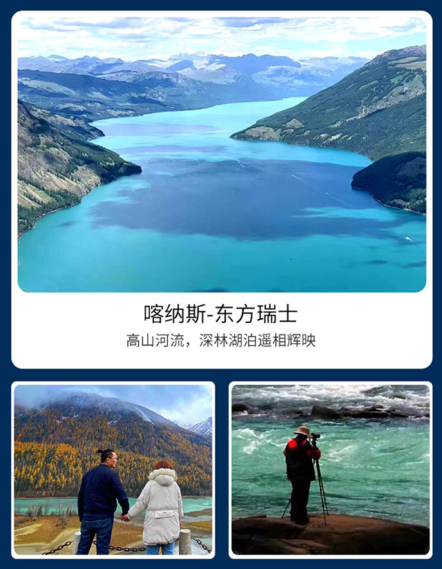 12:00-14:00 抵達賈登峪售票中心,購買(mǎi)門(mén)票換乘區間車(chē)進(jìn)入喀納斯景區,漸入佳境可欣賞到茂密的森林,經(jīng)過(guò)臥龍灣河心小洲輪廓像橫臥的劍龍,月亮灣俯瞰巨大的腳印留在彎月般的河灣,神仙灣水面波光粼粼似閃爍的珍珠光芒,鴨澤湖常能看到野鴨天鵝等水鳥(niǎo);