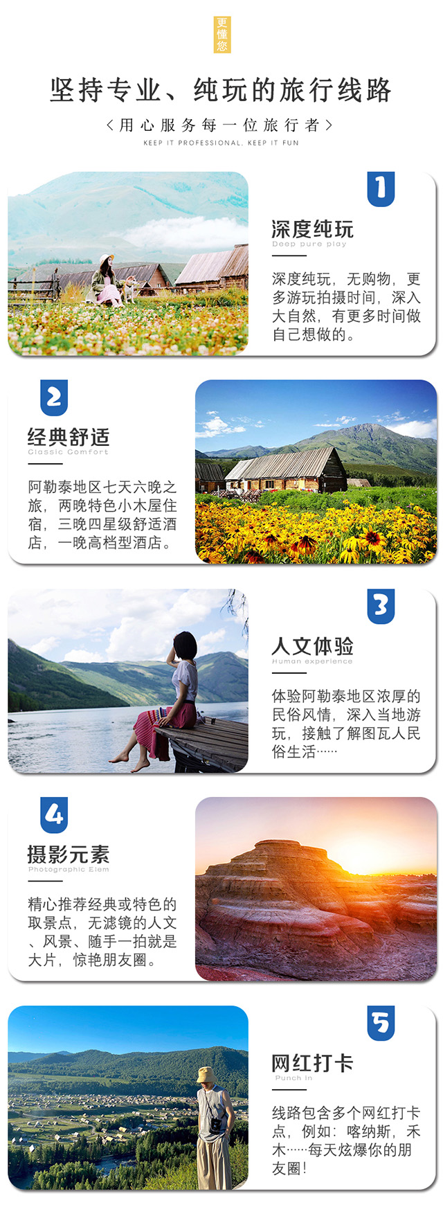 1.喀納斯8日行是一條新疆旅行線(xiàn)路的精華線(xiàn)路,平均每天公里數在300公里左右,因為新疆太大,新疆的景點(diǎn)的距離較遠,所以新疆的旅行有時(shí)在路上的坐車(chē)時(shí)間就是4—8小時(shí),希望大家提前閱讀,提前做好長(cháng)距離坐車(chē)看景的心里準備,我們線(xiàn)路坐車(chē)的時(shí)間和線(xiàn)路的規劃是非常合理的